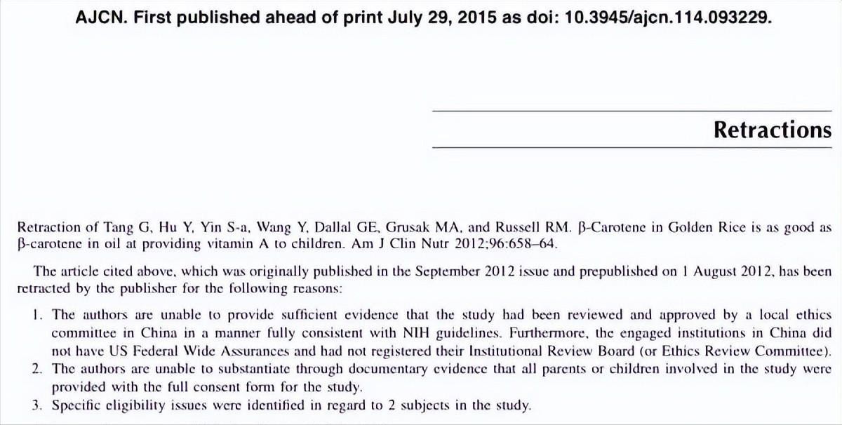 论文名为《“黄金大米”中的β-胡萝卜素与油胶囊中β-胡萝卜素对儿童补充维生素A同样有效》,他们在这篇文章里写到他们曾对中国湖南衡阳市江口镇中心小学25名7岁学生进行过人体试验。