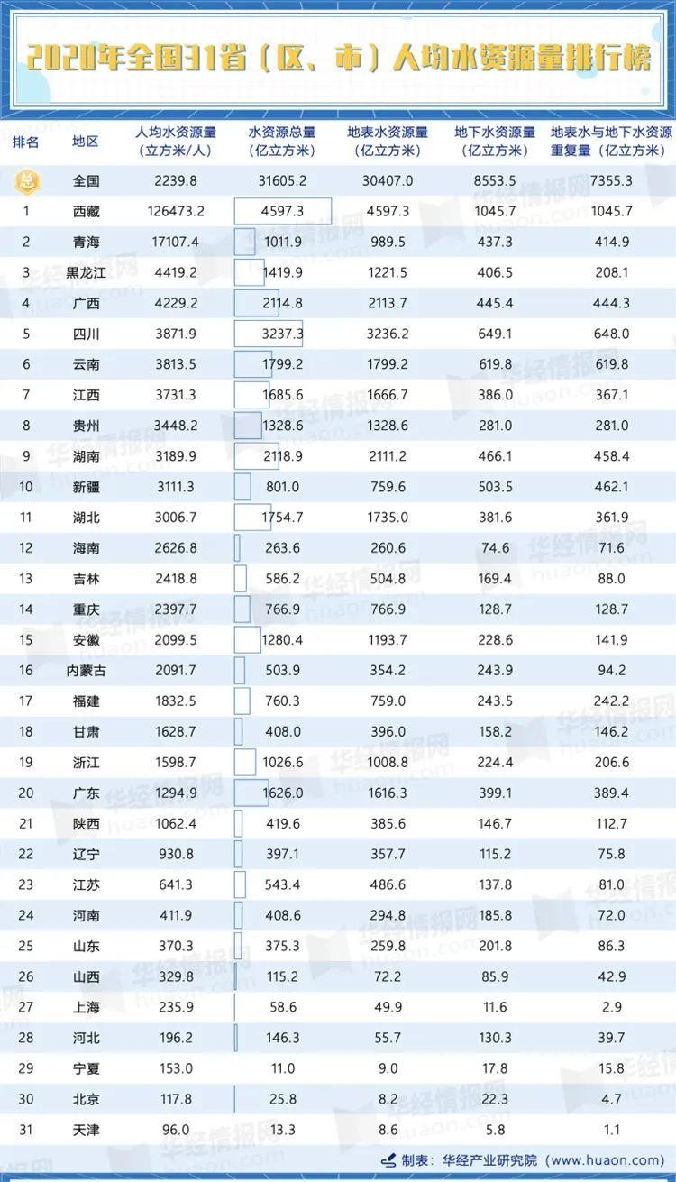 2021年我国水资源总量29520亿立方米,约占全球水资源的6%,仅次于巴西、俄罗斯、加拿大、美国和印度尼西亚,居世界第6位。