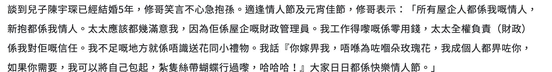 除了对妻子好,石修表示对家里的所有人都很好,他在受访中坦言,他视家里的所有成员都是情人,包括儿媳妇,所以他与儿媳的感情很好,相处融洽,儿媳早就是他为超级偶像,所以翁媳还会贴脸合照,外人看起来可能很难理解,但对石修来说这是证明家人之间感情融洽的表现。