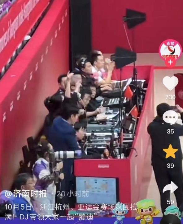 在火热的氛围之下,亚运会官方“气氛组”也带头“嗨起来”。据济南时报消息,10月5日,杭州亚运会女排赛场热身环节,DJ放出一首《你要跳舞吗》,技术官员也挥手起舞,带着现场观众一起“蹦迪”。