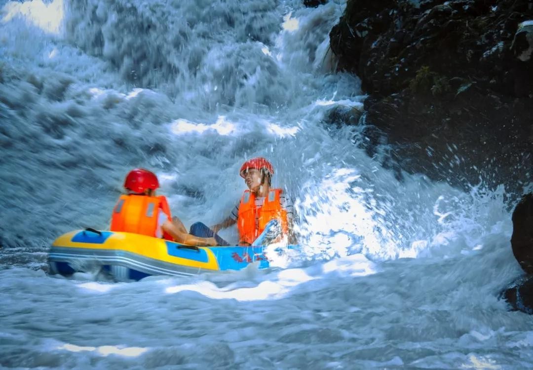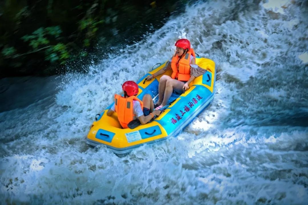 土楼沟漂流位于福建省龙岩市永定区湖坑镇南江村,全长3.8公里,从无人区到村庄入口长1.12公里,落差区位60余个,持续落差高达90米,惊险刺激河段达10余处,后半程从国家AAA级永定土楼南江景区内穿过,河道两岸依次树立有50多座造型各异的土楼,可以边漂边欣赏两岸的土楼美景,漂流全程约90分钟。独具特色的漂流游客服务中心也是现今唯一的一座用土楼改造而成非常具有观赏价值。景区主打“游人水中漂,土楼两岸走”的特色主题,让游客即可体验激情四射的漂流,又可以浪漫观赏两岸的土楼美景。
