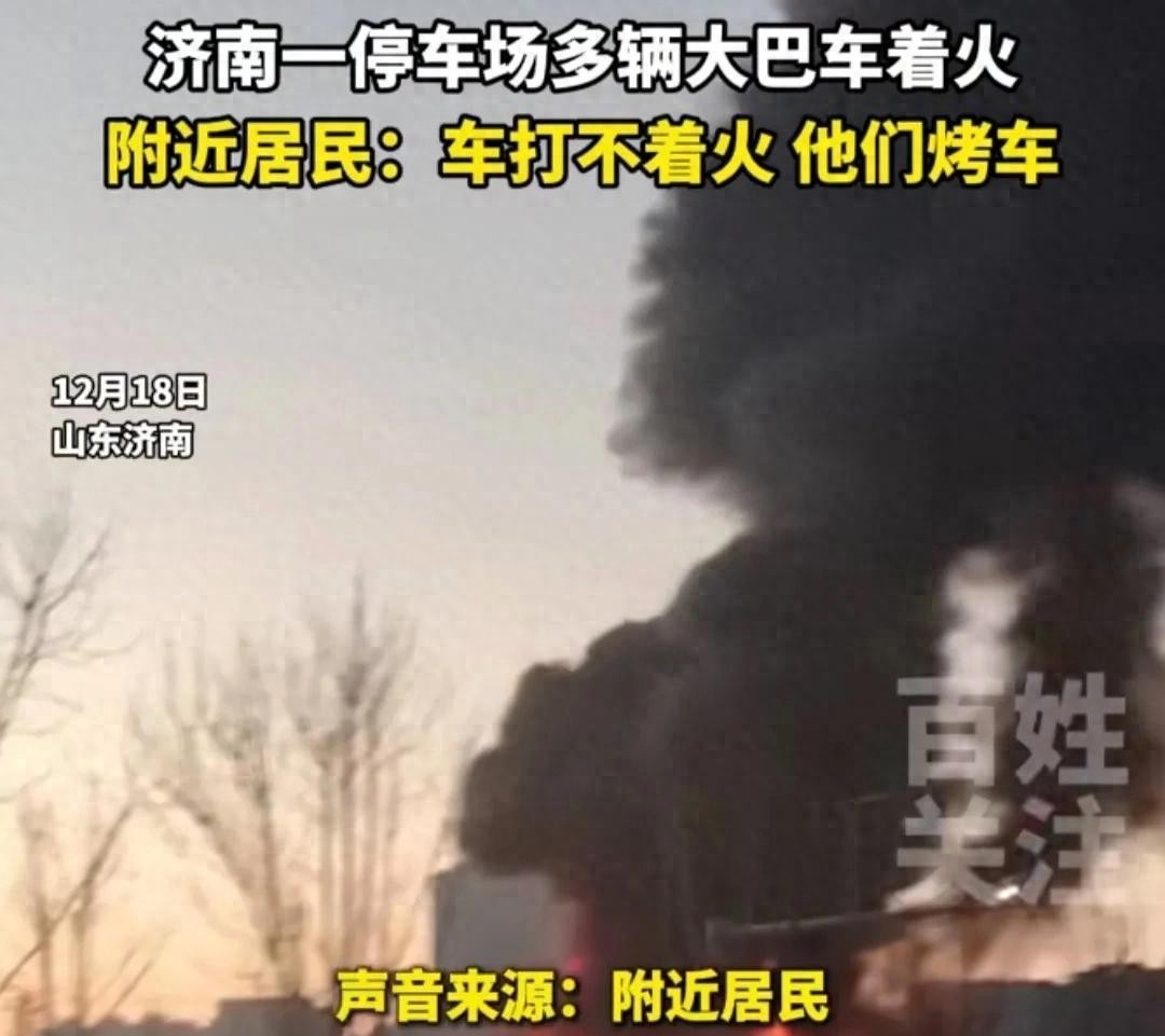 济南一停车场多辆大巴车着火,附近居民车子打不着火、他们烤车