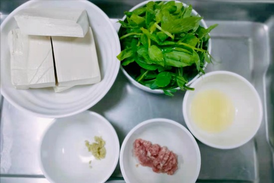 制作时所需要准备的食材,白豆腐四块,带着露水的稚嫩豌豆苗 15 0克,姜末 5克、鸡蛋清 1 个、还有鲜肉末 50 克,在选择豆腐丸子配菜时可以搭配其他的食材,比如小白菜、小青菜都是不错的选择。