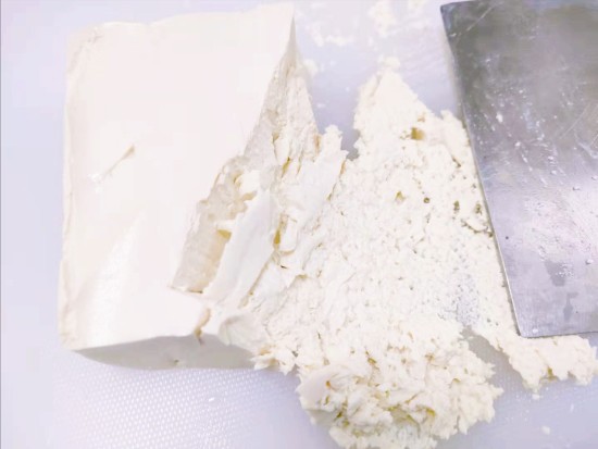 1、在选豆腐时选质感优质的,水分太重的豆腐不容易打上筋,如果购买时买到水分重的需要用纱布挤出水分后,再进行踏泥这个步骤。