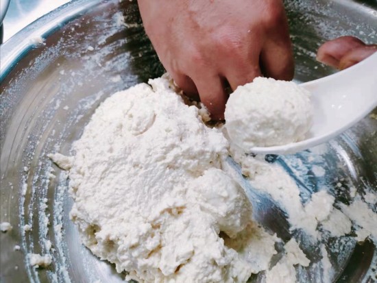 在打好豆腐泥后,可以用手和勺子试做一下看看,挤出来的豆腐丸子是不是可以成形,成形