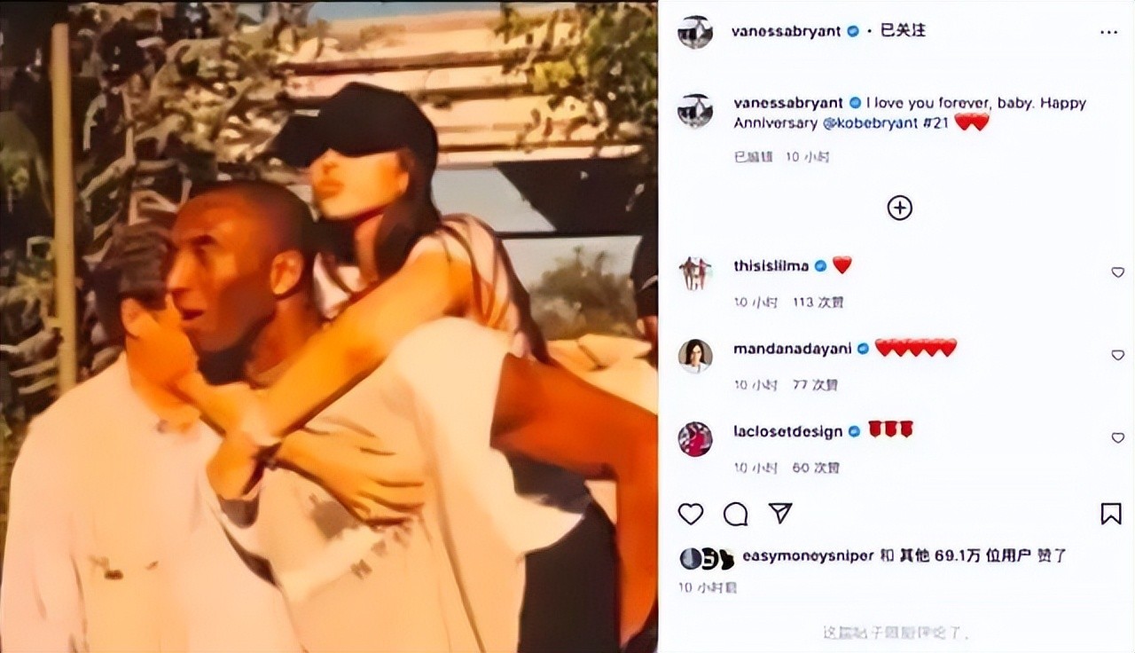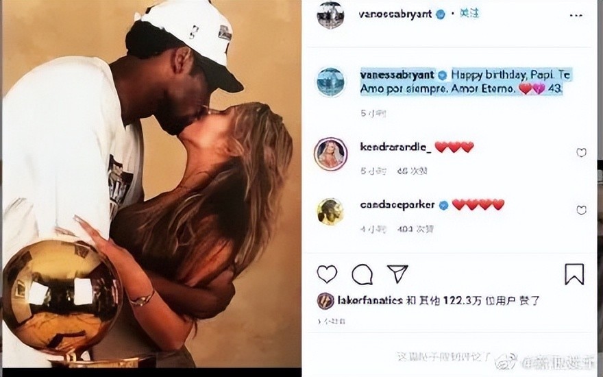 去年8月23日科比生日,她晒出一张亲吻照,并配文: