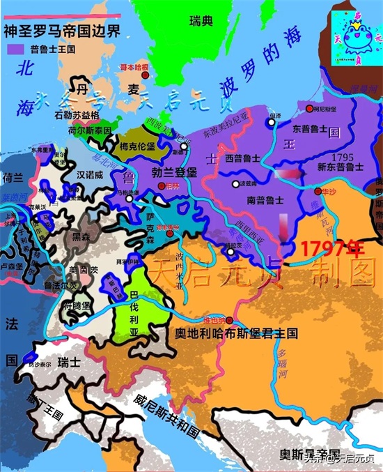1797年,腓特烈·威廉二世去世。毫无疑问,他开启了普鲁士王国的衰退期,但也就是在这个衰退期,通过瓜分波兰,普鲁士王国的版图达到了惊人的30万平方公里,人口900多万,其中有350万是波兰人。