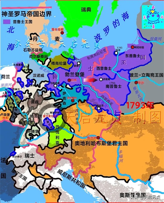 1793年,普鲁士与俄罗斯第二次瓜分波兰,得到了但泽和南普鲁士。也就在此前一年,普鲁士与奥地利干涉法国大革命的军队被打败。