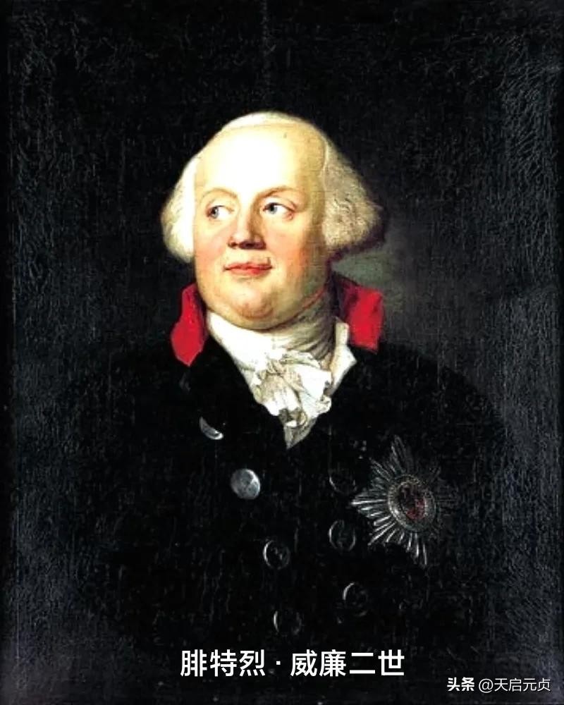 腓特烈大帝没有子嗣,死后传位给了弟弟的儿子,是为腓特烈·威廉二世,又称“胖威廉”。侄子腓特烈·威廉二世显然没有他大爷有才能,但借着腓特烈大帝打下的基础,普鲁士的领土仍在增加。