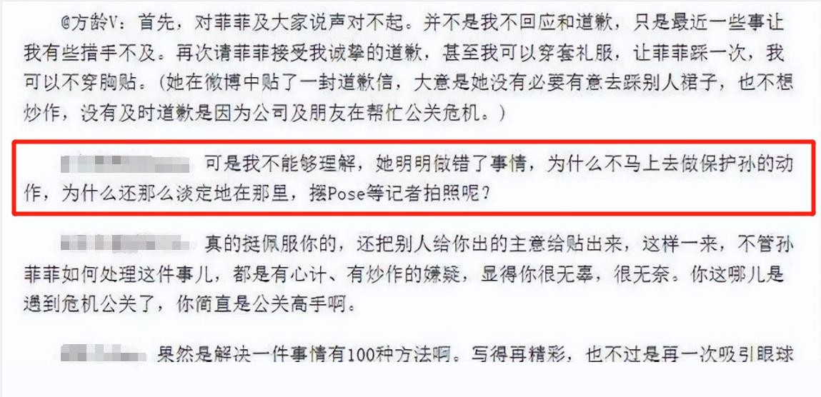 事后,主持人方龄被网友炮轰没有第一时间帮助孙菲菲解决困境,任由记者拍照。
