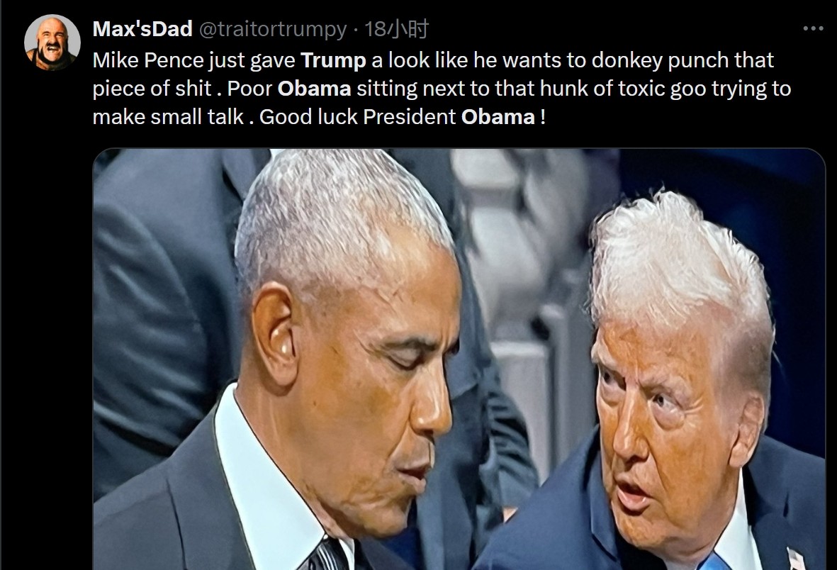 还有这一位表示,迈克·彭斯只是看了特朗普一眼,就好像他想揍“那块烂泥(指特朗普)”。可怜的奥巴马坐在那块“有毒的黏糊糊的东西(指特朗普)”旁边,竟还试图和他闲聊,祝奥巴马总统好运吧!