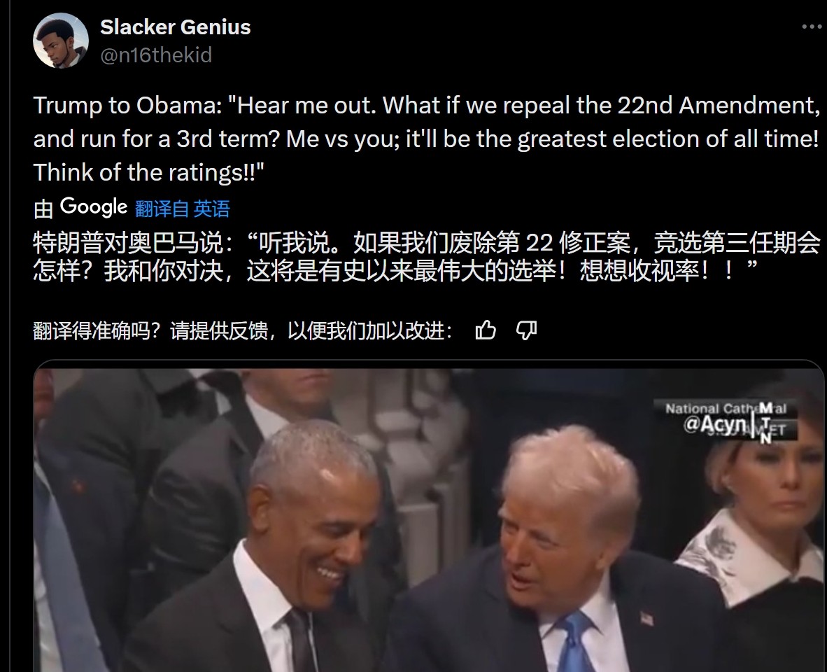 比如有网友表示“猜测”:特朗普对奥巴马说,“听我说,如果我们废除第22修正案,竞选第三任期会怎样?我和你对决,这将是有史以来最伟大的选举!想想收视率!!”
