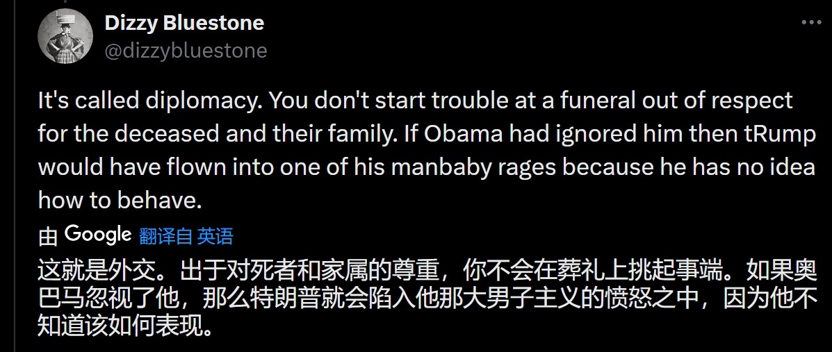 有的人对于能看到五位总统没在葬礼上“闹事”感到满意,认为是奥巴马的风度“拯救了特朗普和这场葬礼”。比如这位网友表示:这就是“外交”,出于对死者和家属的尊重,你不会在葬礼上挑起事端。如果奥巴马忽视了特朗普,那么特朗普就会陷入他那大男子主义的愤怒之中,因为他不知道该如何分清场合。
