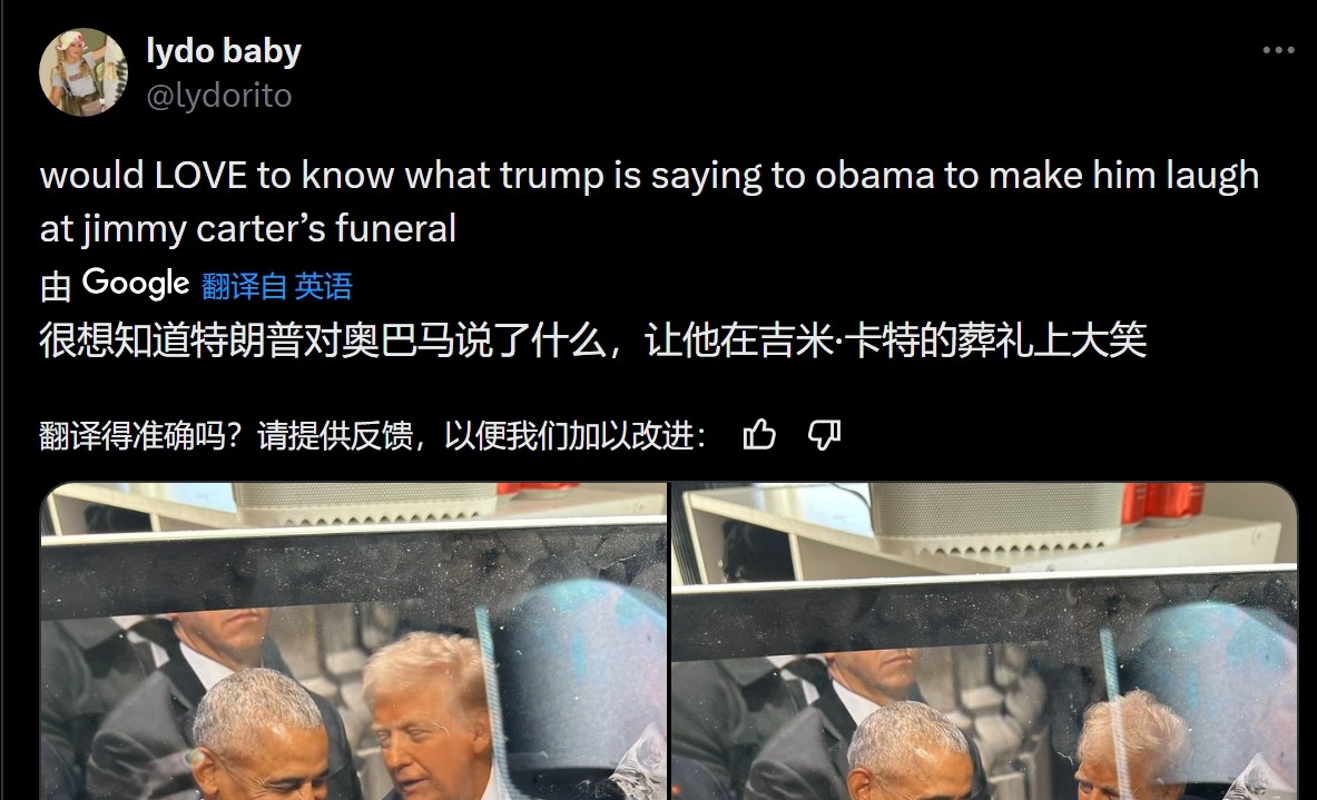 也有人对奥巴马感到不满,认为他的大笑过于轻佻。比如这位网友表示,“很想知道特朗普对奥巴马说了什么,让他在吉米·卡特的葬礼上大笑!”