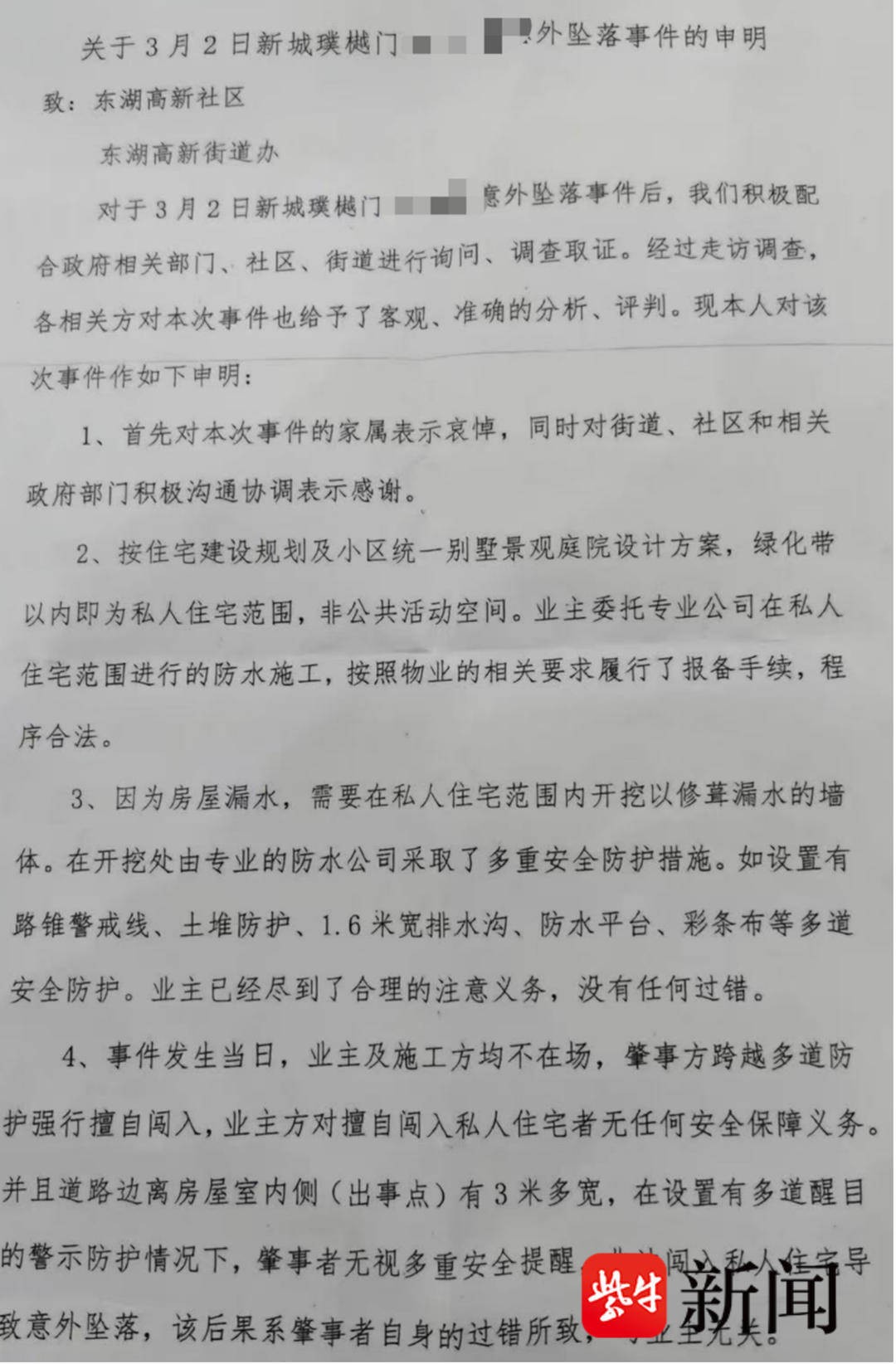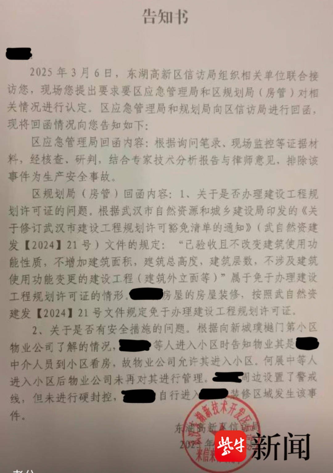 记者了解到,3月13日,武汉东湖新技术开发区有关部门就此事件作出了《告知书》。《告知书》显示,排除该事件为生产安全事故。根据武汉市自然资源和城乡建设局印发的《关于修订武汉市建设工程规划许可豁免清单的通知》(武自然资建发【2024】21号)文件的规定:“已验收且不改变建筑使用功能性质,不增加建筑面积,建筑总高度,建筑层数,不涉及建筑使用功能变更的建设工程(建筑外立面等)”属于免于办理建设工程规划许可证的情形。涉事房屋的房屋装修,按照相关规定免于办理建设工程规划许可证。根据向新城璞樾门第小区物业公司了解的情况,何先生等人进入小区时告知物业其是中介人员到小区看房,故物业公司允许其进入小区。何先生等人进入小区后,物业公司未再对其进行管理。涉事房屋周边设置了警戒线,但未进行硬封控,何先生自行进入装修区域发生该事件。