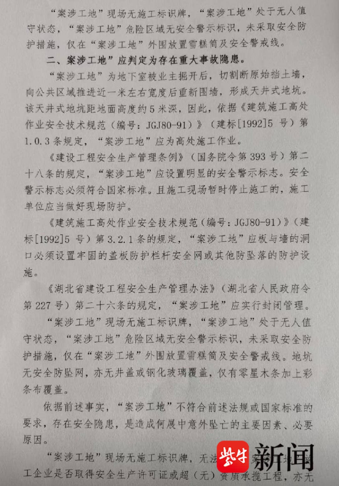 李女士则主张该涉事工地及其基坑周边的安全警示标志不符合国家标准,且施工现场暂停施工时没有做好现场防护,应判定为存在重大事故隐患,该事件应为生产安全事故,并于3月16日递交了行政复议申请书。