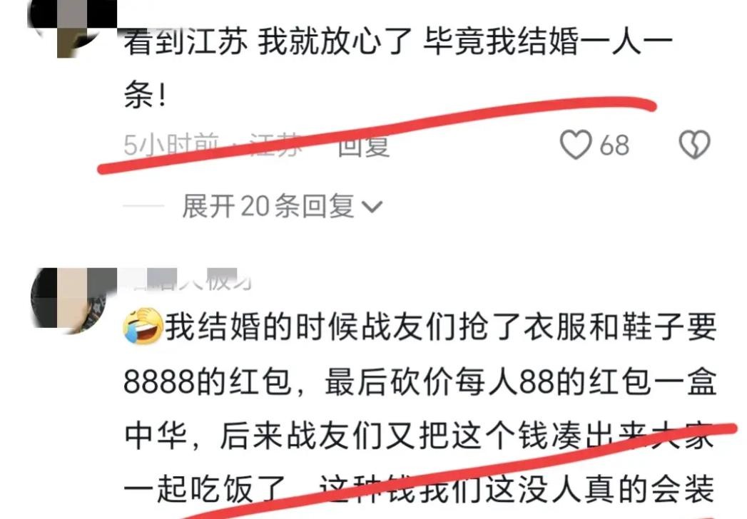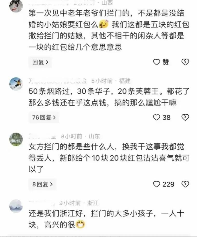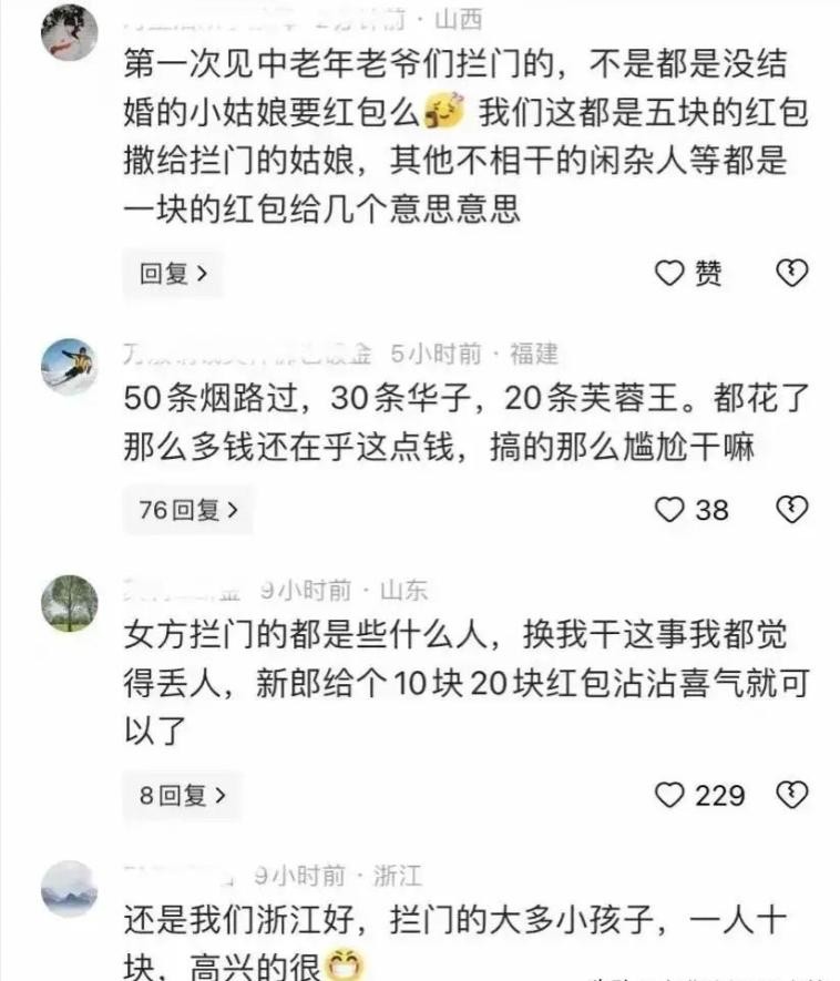 还有网友说自己结婚那会儿,花了不少钱,“50条烟,30条中华,20条芙蓉王”,觉得大家不应该在乎这点钱,免得尴尬。但这种看法其实有点问题,毕竟不是每家的经济条件都那么宽裕,2万块钱也不是小数目,随便就给了那些拦路的亲戚,不但可能收不到祝福,还可能被人骂“傻瓜”。