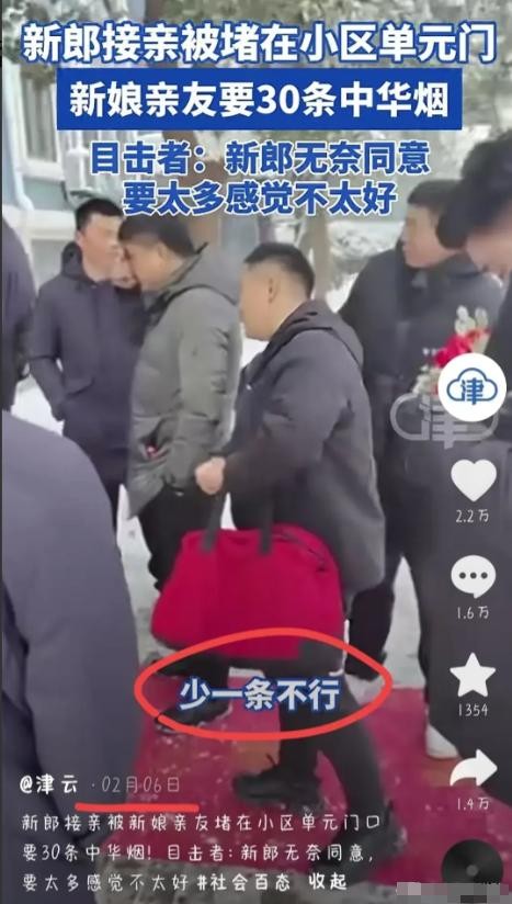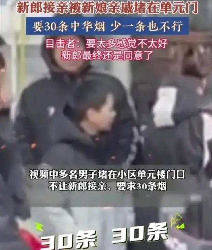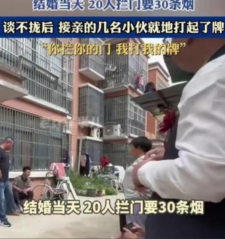 最近,江苏宿迁有个新郎去接新娘,结果新娘家门口20个人挡着楼梯,非让他给30条烟,这事儿引起了很多网友的关注和讨论。