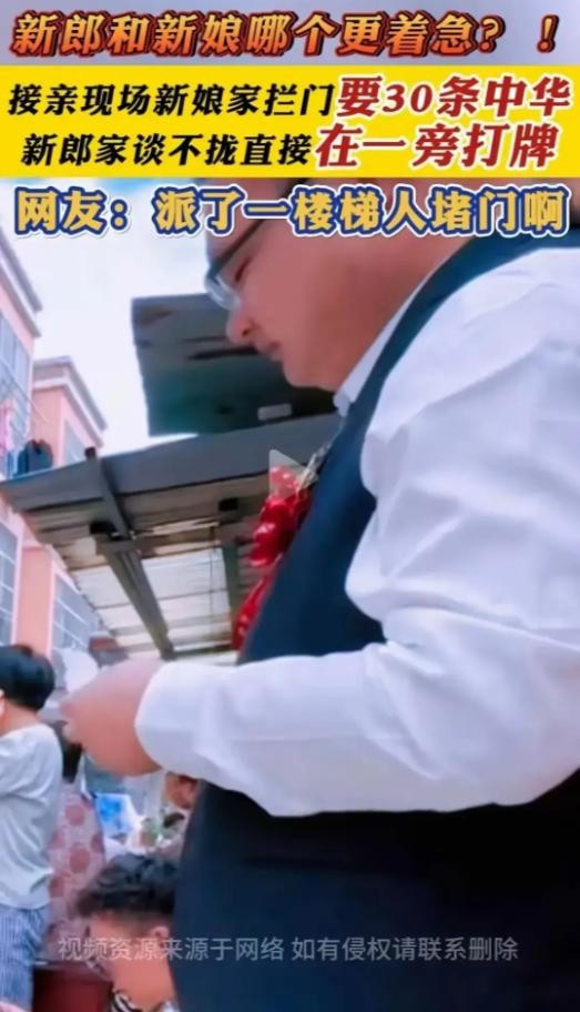 新郎当场就傻眼了,这接亲的事怎么搞得像是在打劫呢?双方争执不休,场面一度很尴尬。新郎也不急了,就叫兄弟们在楼下打牌,边打边说:“反正闲着也是闲着”。