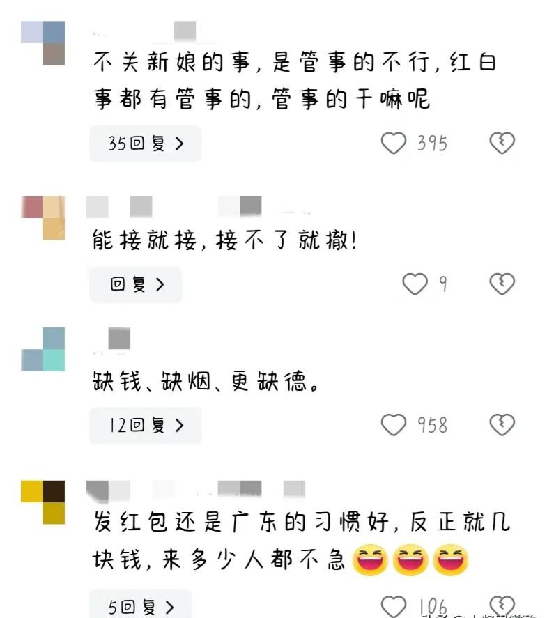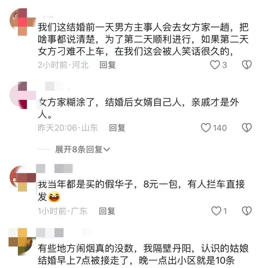 还有网友提议:“直接问新娘出不出来,不出来就当是亲戚聚餐了。”他们还说:“嫁女儿那天,接亲的人,一人一盒和天下烟就行,别给女儿添麻烦。”