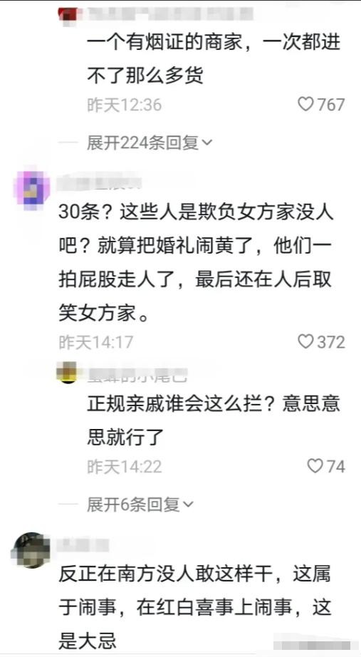 给每人一盒烟还说得过去,但30条烟明显就太过分了吧!结婚本来是大家高高兴兴来凑热闹的,搞成这样就变味了,简直就是敲诈勒索!