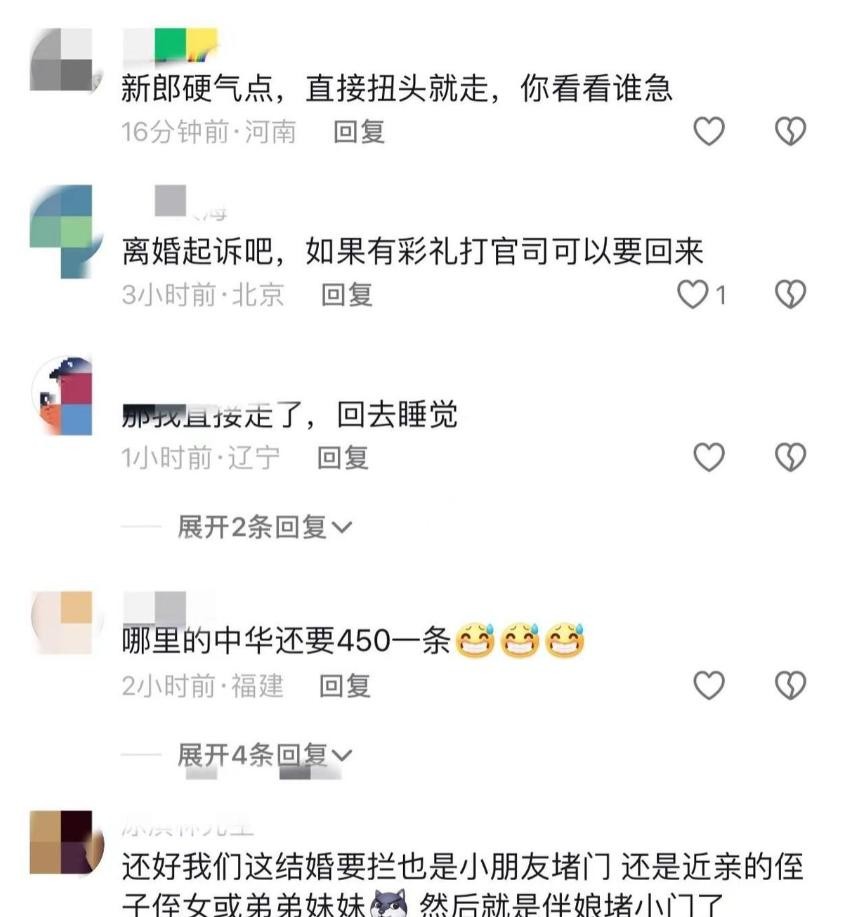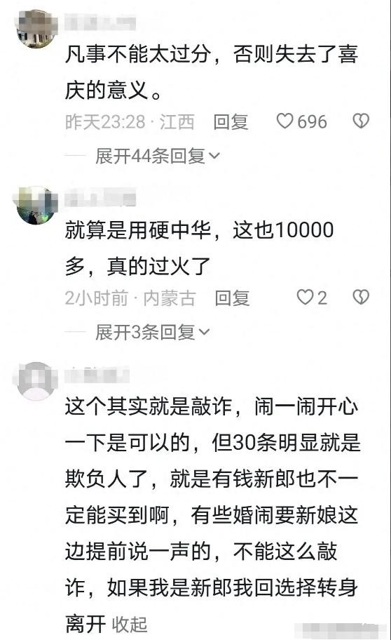 有网友建议新郎该硬气点,遇到这种过分的要求就应该转身就走,看最后谁耐得住。我想,即使新郎真这么做了,场面也肯定不好看。毕竟结婚是大事,谁也不想搞得太僵。估计最终还是得通过协商,找个中间的解决办法,才能让婚礼顺利进行。不过,这种拦门要红包的做法,真的该改改了。