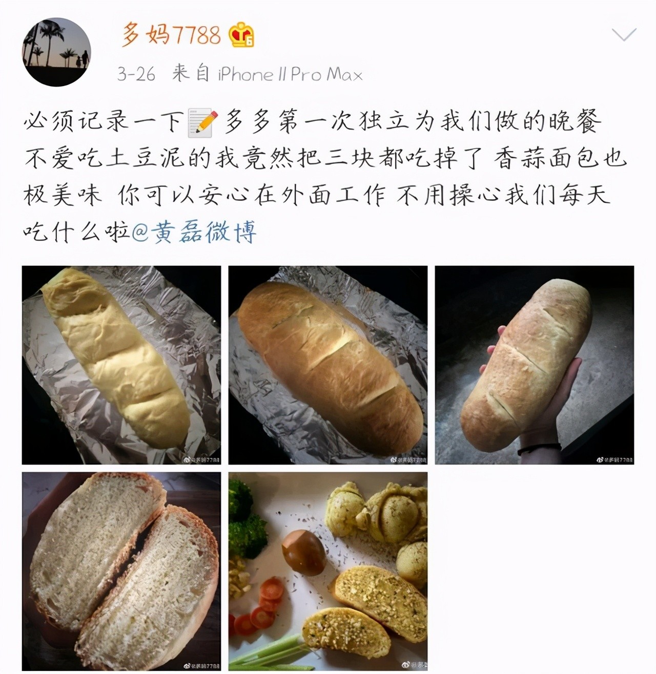 所以,多多妈妈也忍不住夸奖女儿说——"不爱吃土豆泥的我竟然把三块都吃掉了,香蒜面包也极美味。"还喊话黄磊说:"你可以安心在外工作,不用操心我们每天吃什么啦。"