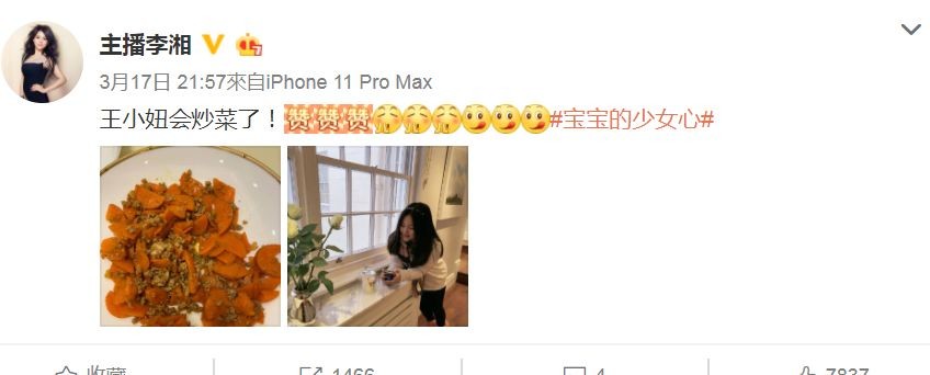 李湘曾经在社交平台上放出王诗龄的动态,欣喜地表示:“王小妞会炒菜了!”其配图就是王诗龄亲手做的菜肴。