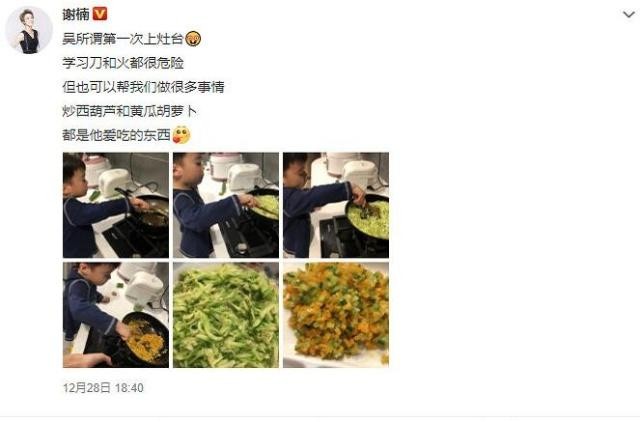 无独有偶,吴京的爱妻谢楠也为吴所谓的厨艺点赞、欣慰。她曾记录了吴所谓第一次下厨“首秀”,还配文说:“吴所谓第一次上灶台,学习刀和火都很危险,但也可以帮我们做很多事情,炒西葫芦和黄瓜胡萝卜,都是他爱吃的东西。”