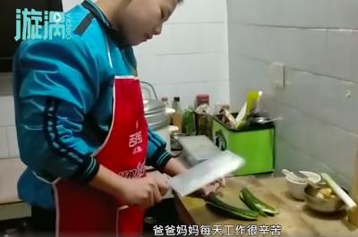 妈妈不放心,偷偷一看,只见孩子穿上了围裙,认真切菜,从洗、切、炒、蒸,全是一个人操刀完成。