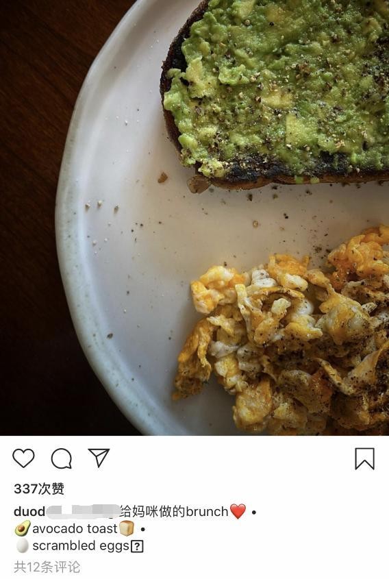黄磊的女儿多多也晒过自己给妈妈做的美食,配文说:给妈妈做的brunch avacado toast scrambled eggs。别说,这菜品卖相还挺好。