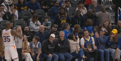 而且啊,这场比赛还有个小插曲,第三节还剩 2 分多钟的时候,杜兰特和看台上的老佩顿对喷垃圾话,这可把杜兰特给惹毛了,接下来他直接开启 “死神模式”,连着飙进三记三分,那气势,直接把现场气氛给点燃了,观众们都被他这一波操作给惊呆了,纷纷为他鼓掌叫好。