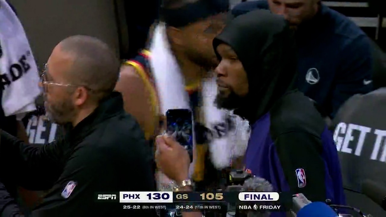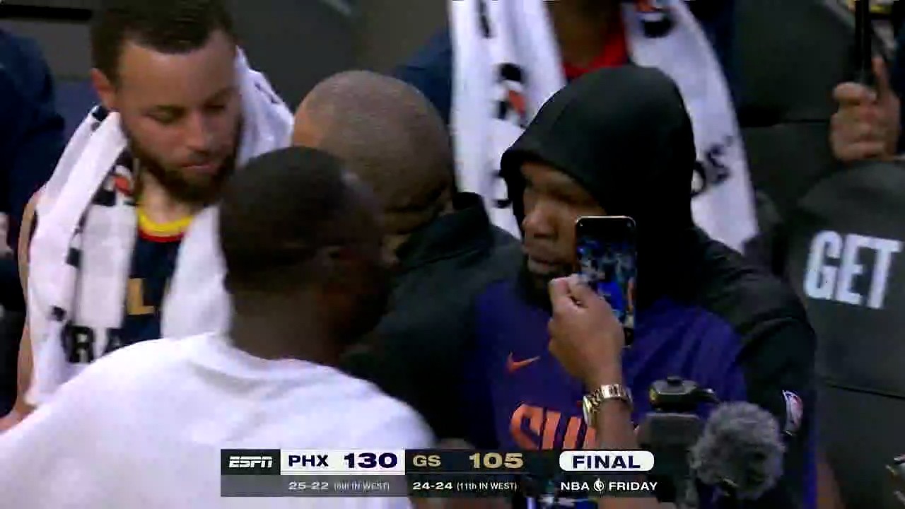 杜兰特站在场边,就等着库里呢,那架势,感觉有好多话想跟库里说。