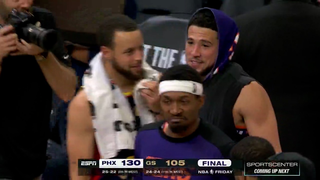 布克也没闲着,看到库里后,也主动上前和库里拥抱。