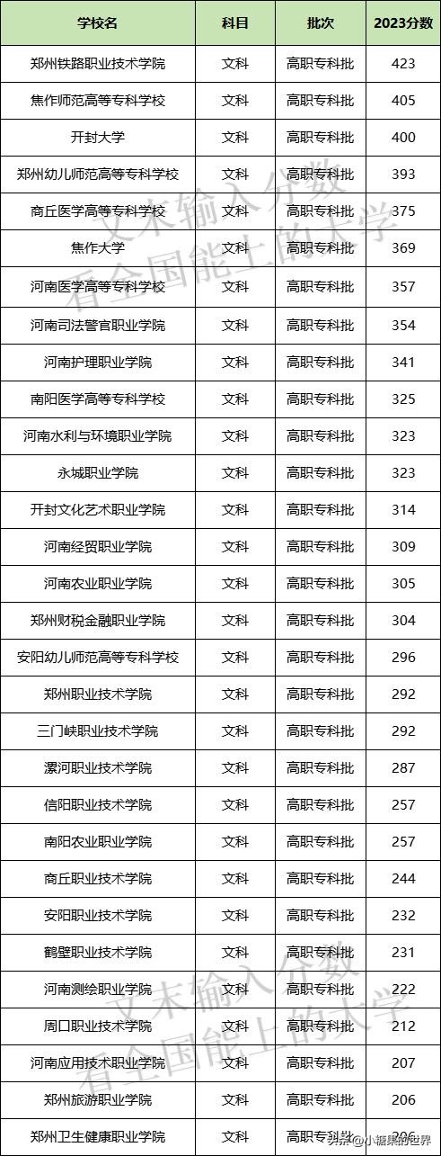 河南所有公办大专文科分数线表