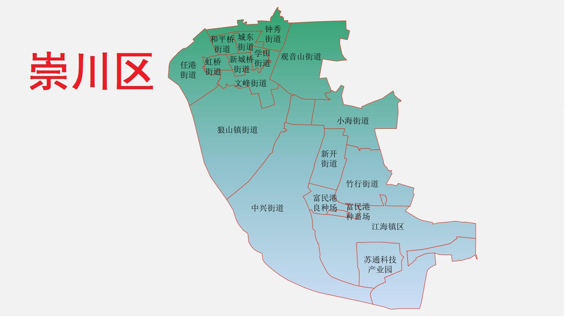 崇川区总面积234平方千米 ,下辖16个街道 ,即虹桥街道、学田街道、钟秀街道、文峰街道、观音山街道、城东街道、和平桥街道、任港街道、新城桥街道、狼山镇街道、唐闸镇街道、秦灶街道、幸福街道,陈桥街道、永兴街道、天生港镇街道。截至2022年末,崇川区常住人口122.46万人。