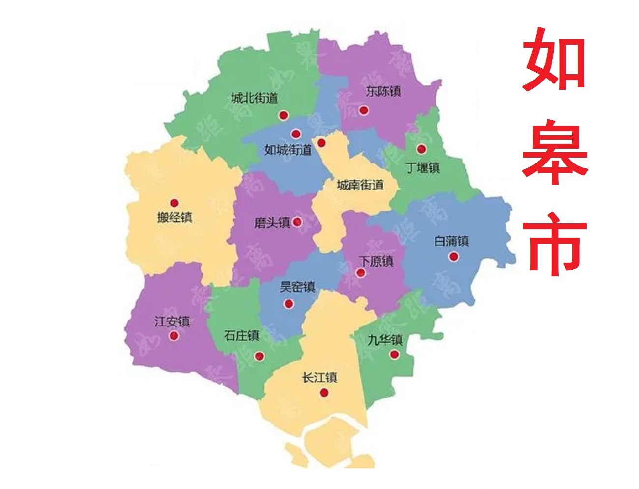 如皋市总面积1576.47平方千米,下辖3个街道(如城街道、城南街道、城北街道)、11个镇 (下原镇、九华镇、石庄镇、东陈镇、丁堰镇、白蒲镇、吴窑镇、江安镇、搬经镇、磨头镇、长江镇)。截至2022年末,如皋市常住人口122.23万人 。