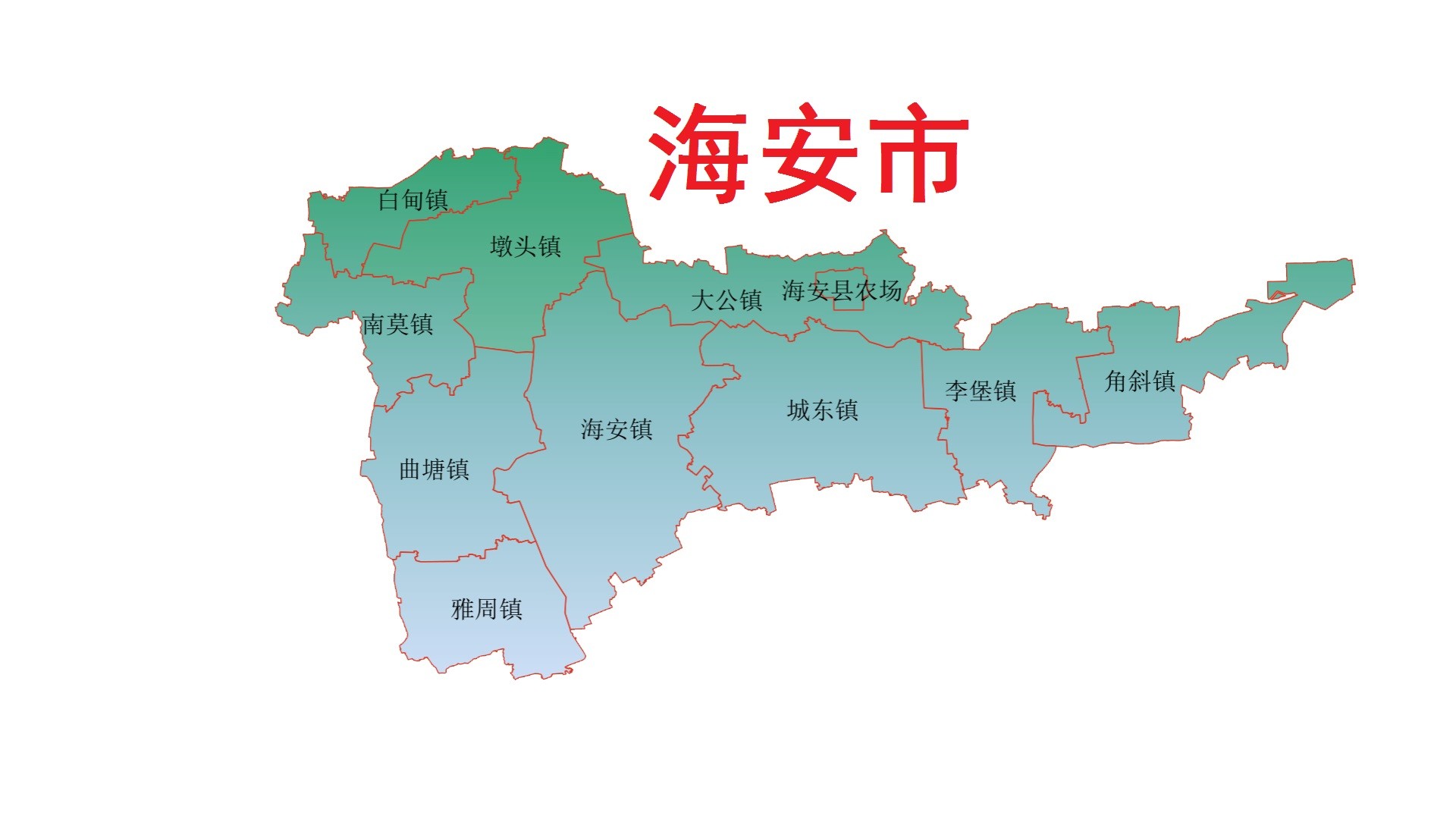 海安市,市政府驻海安街道。地处南通市域西北部,东临黄海,东南接如东县,南临如皋市邻,西与泰州市姜堰区、泰兴市交界,北与盐城市东台市接壤。