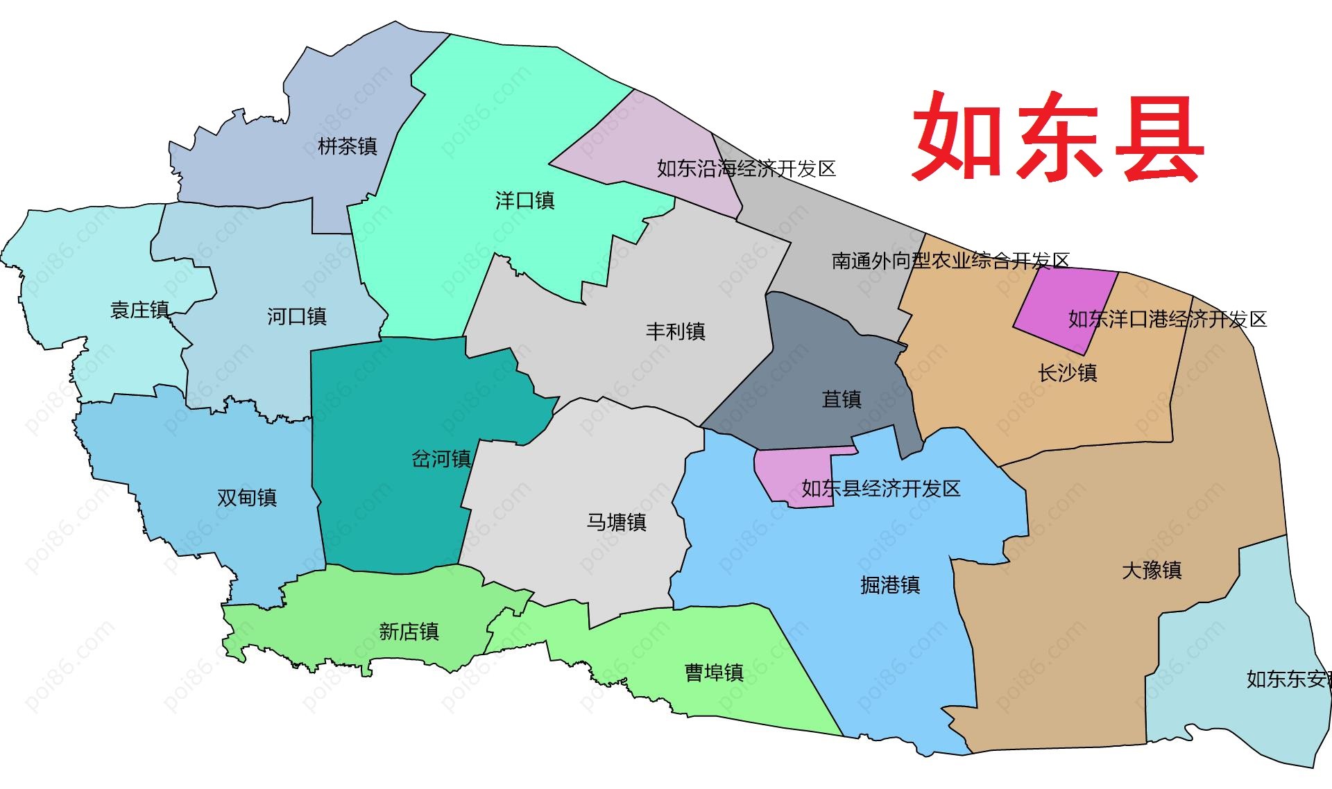 如东县陆域面积2122平方千米,辖3个街道(城中街道、掘港街道、苴镇街道)、12个镇 (马塘镇、岔河镇、双甸镇、栟茶镇、袁庄镇、大豫镇、新店镇、长沙镇、曹埠镇、河口镇、洋口镇、丰利镇)。截至2022年末,如东县常住人口87.67万人。
