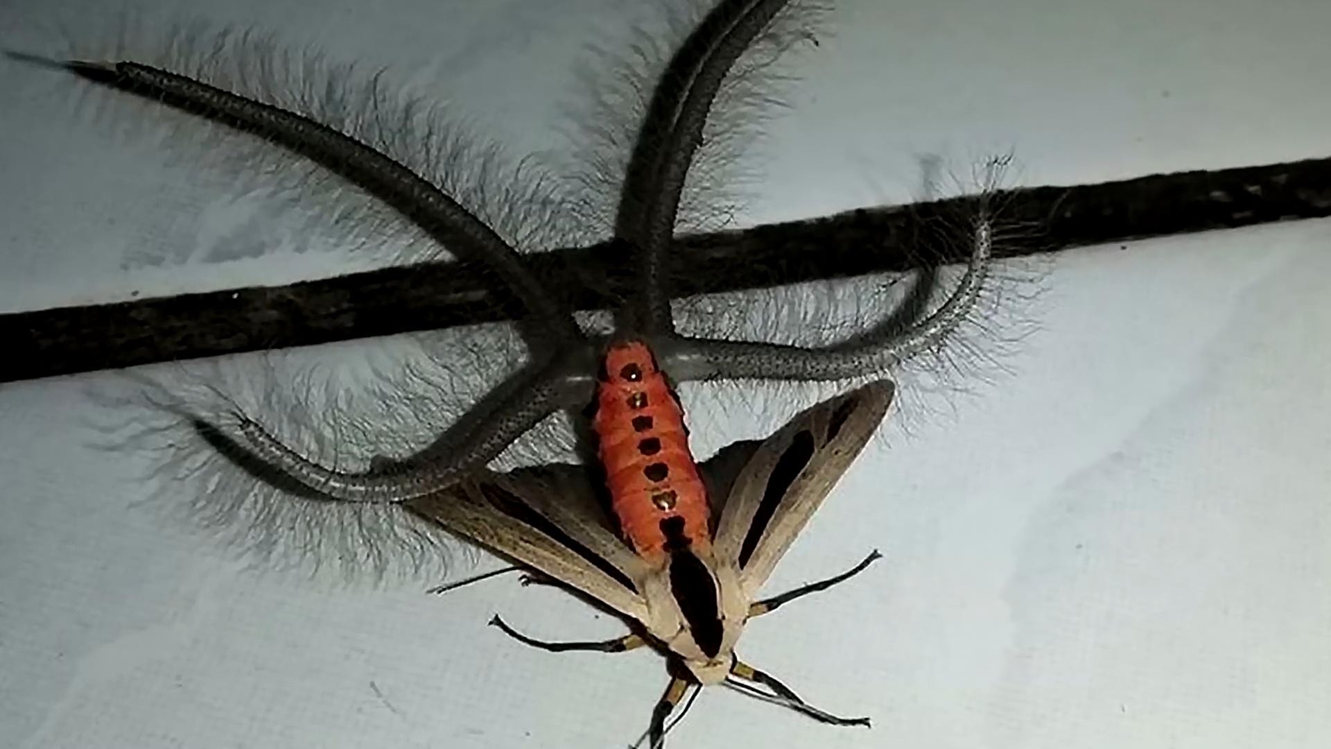 飞蛾相信大家都见过,但是屁股上长着4只长长触手的飞蛾,你有见过吗?黑条灰灯蛾多分布于东南亚地区,在我国的广东贵州等地也均有分布。只是,它们一般都生活在野外,所以很少有人发现过它们。