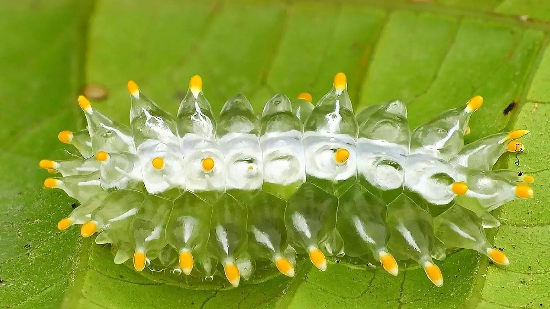 平日里,这些蟹黄水晶毛虫会爬到高高的树叶上进食,经过阳光的照射,它们背上的“果冻状”结构会发出耀眼的光芒,闪瞎捕食者们的“钛合金狗眼”,以此避免遭到它们的猎食。
