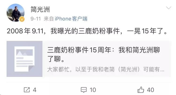 2023年9月11日,简光洲在微博上转发了前东方早报同事的文章。他感慨万分,三鹿奶粉事件已过去十五年。15年过去了,据报道,三鹿集团的前董事长田文华经过几次减刑,将在明年出狱。然而,那些因三鹿奶粉受害的孩子和家长们,永远不会原谅涉事的人员。同时,他们也会对那些不畏强权、坚守正义,揭露真相的简光洲记者和张伟医生表示深深的感谢,并为他们的平安祈祷。