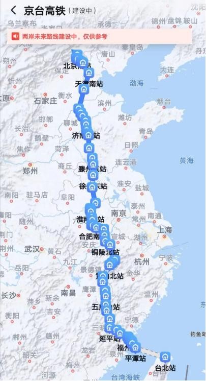 2022年8月8日,在手机地图软件中搜索“北京-台北”路线,就可看到路线规划中包含“京台高铁”。虽然把高铁修到台湾去是很早就已经规划的事,但在地图上显示出来,在时间上却别有一番含义。