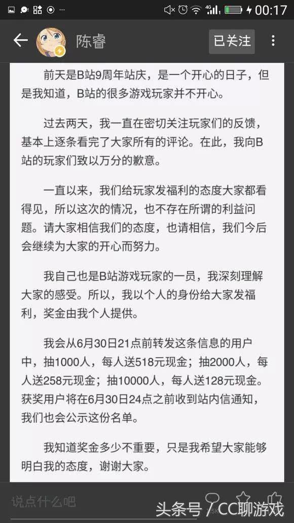 开发票的行动开始了没几个小时,B站董事长陈睿就在bilibili动态回应B站9周年活动FGO不参与事件,并转发抽奖总共231万“致歉”。