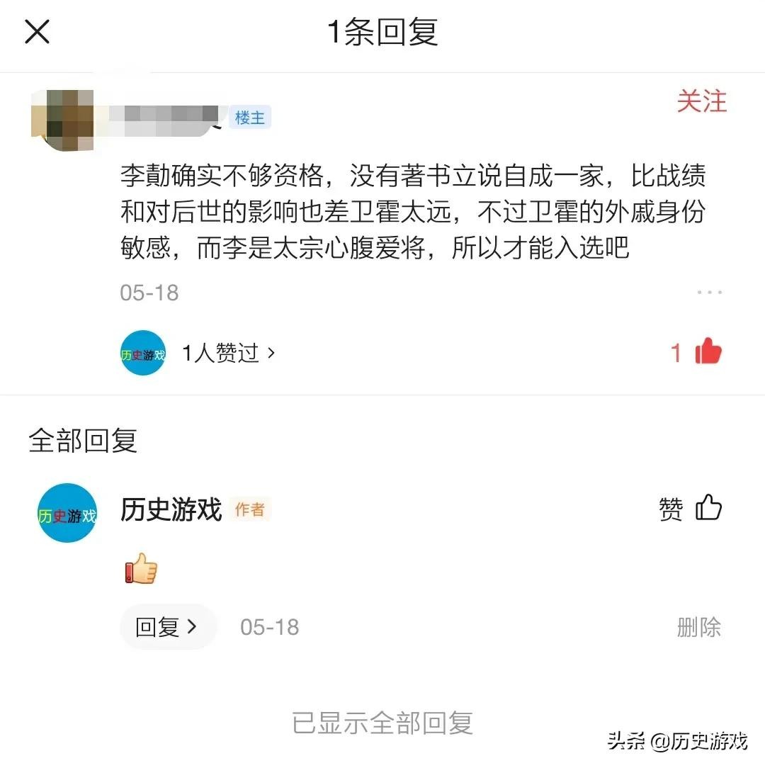 虽然上图中第一张的评论不对(按他的说法,光一个李靖就可以了),但李勣能进武庙十哲,确实是因为当时设立武庙十哲的唐玄宗需要两个唐朝名将。