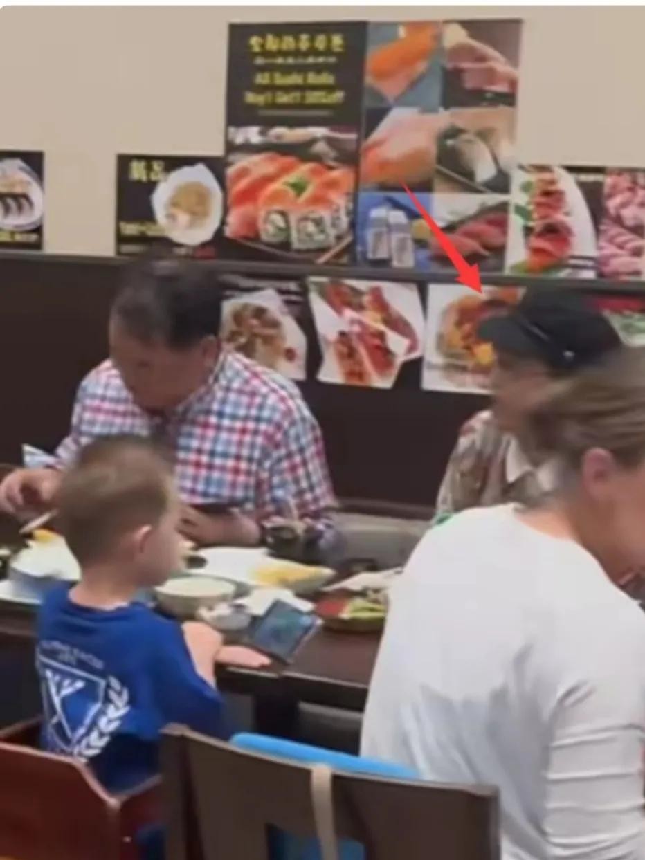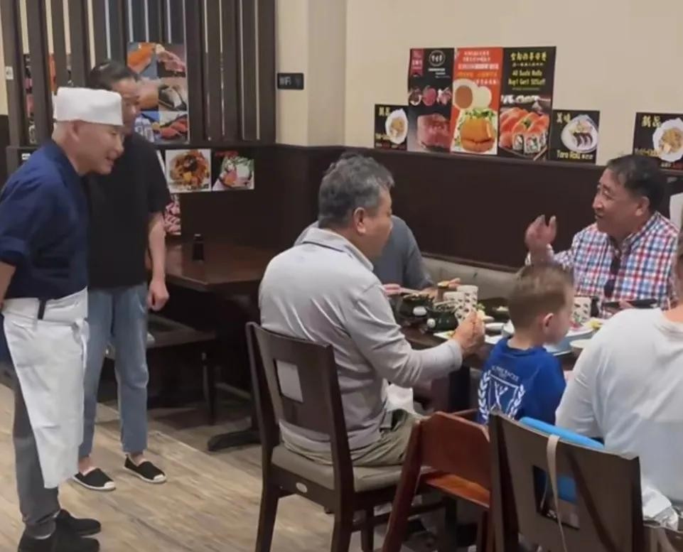 这次同行阵容堪称"姜昆全家总动员":姜昆夫妇坐主位,对面戴着金丝眼镜的中年男士(可能是经纪人),斜对角的小男孩穿着漫威联名卫衣,埋头猛吃。最逗的是姜昆给孙子(猜测)夹寿司时,小男孩突然用日语来了句"ありがとう",姜昆愣了两秒,用筷子敲他碗边:"跟爷爷说中文!"