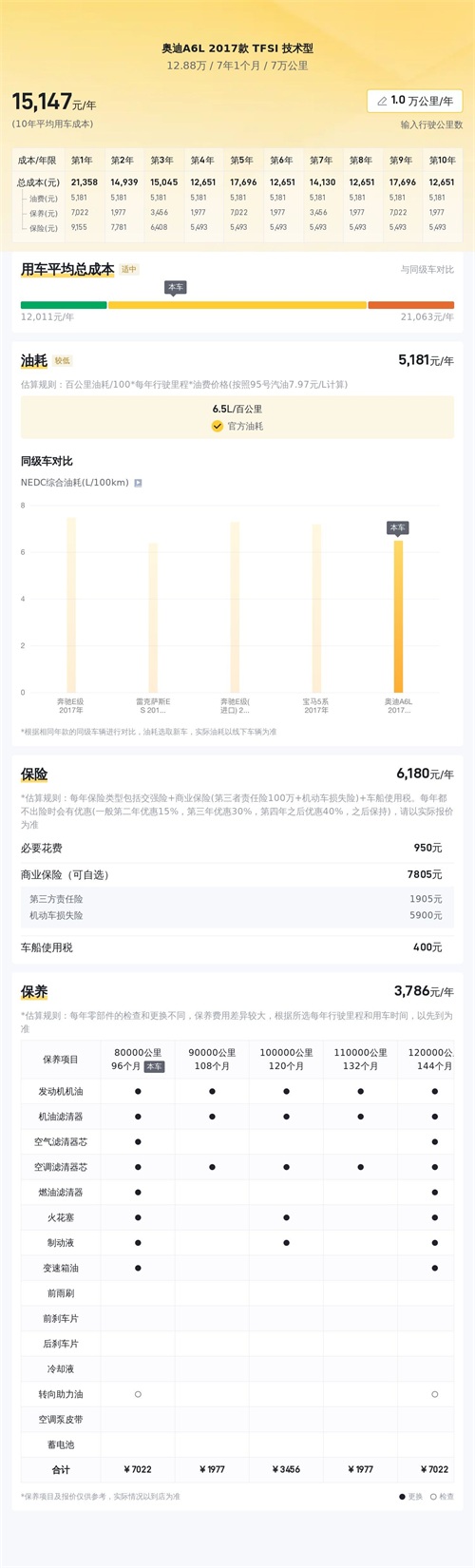 经过懂车帝的大数据分析,该车的10年平均用车成本约为15,467元/年,这在同级别车型中处于较低的水平。这一数据包括了油费、保险费以及保养费等日常用车所需的费用。其中,油费约为6,554元/年,保险费约为5,564元/年,保养费约为2,349元/年。这一较低的用车成本,使得该车更加适合那些追求性价比的消费者。