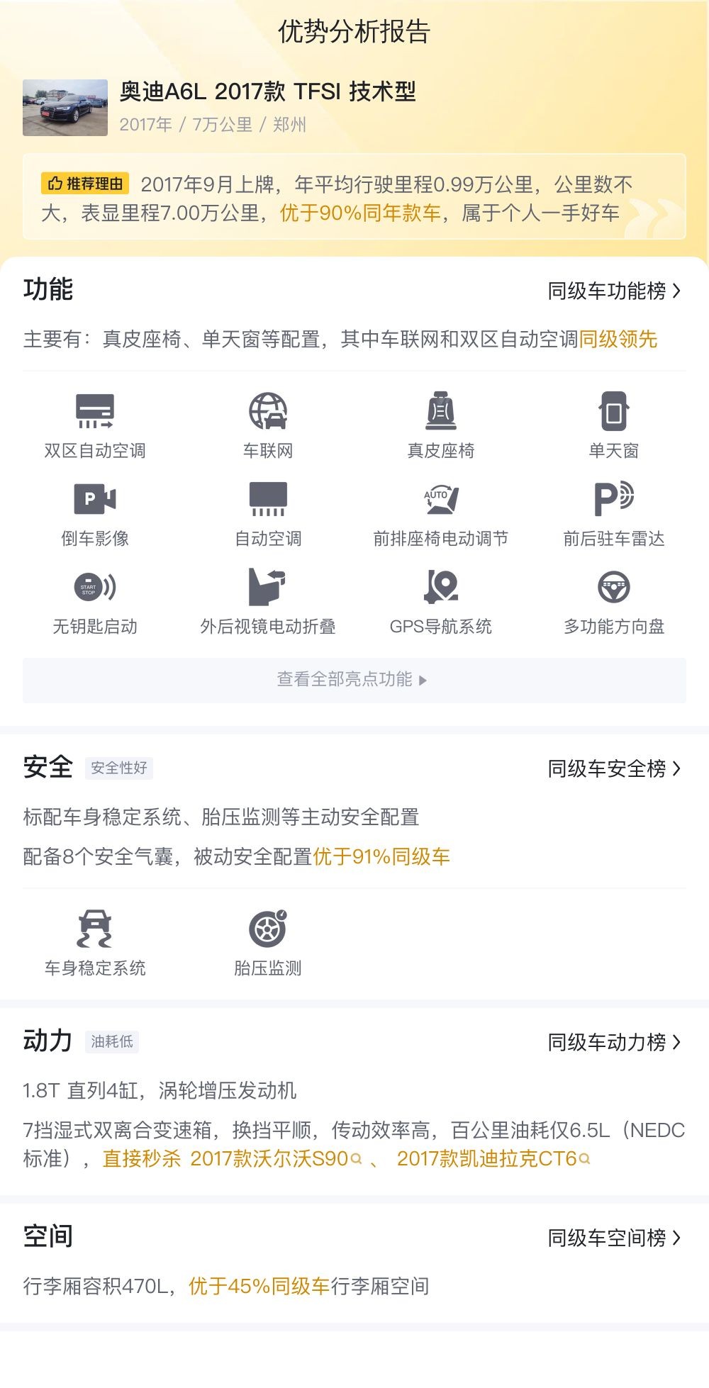该车的具体版本是——2017款奥迪A6L TFSI技术型,上牌地为郑州,上牌日期2017年9月,表显里程7.00万公里,新车指导价41.88万,二手车报价12.88万,过户次数0次。符合国V排放标准。