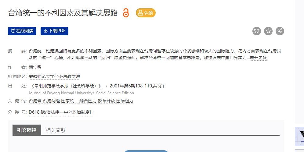 参考资料:[1]杨守明.台湾统一的不利因素及其解决思路[J].阜阳师范学院学报(社会科学版),2001(6):108-110