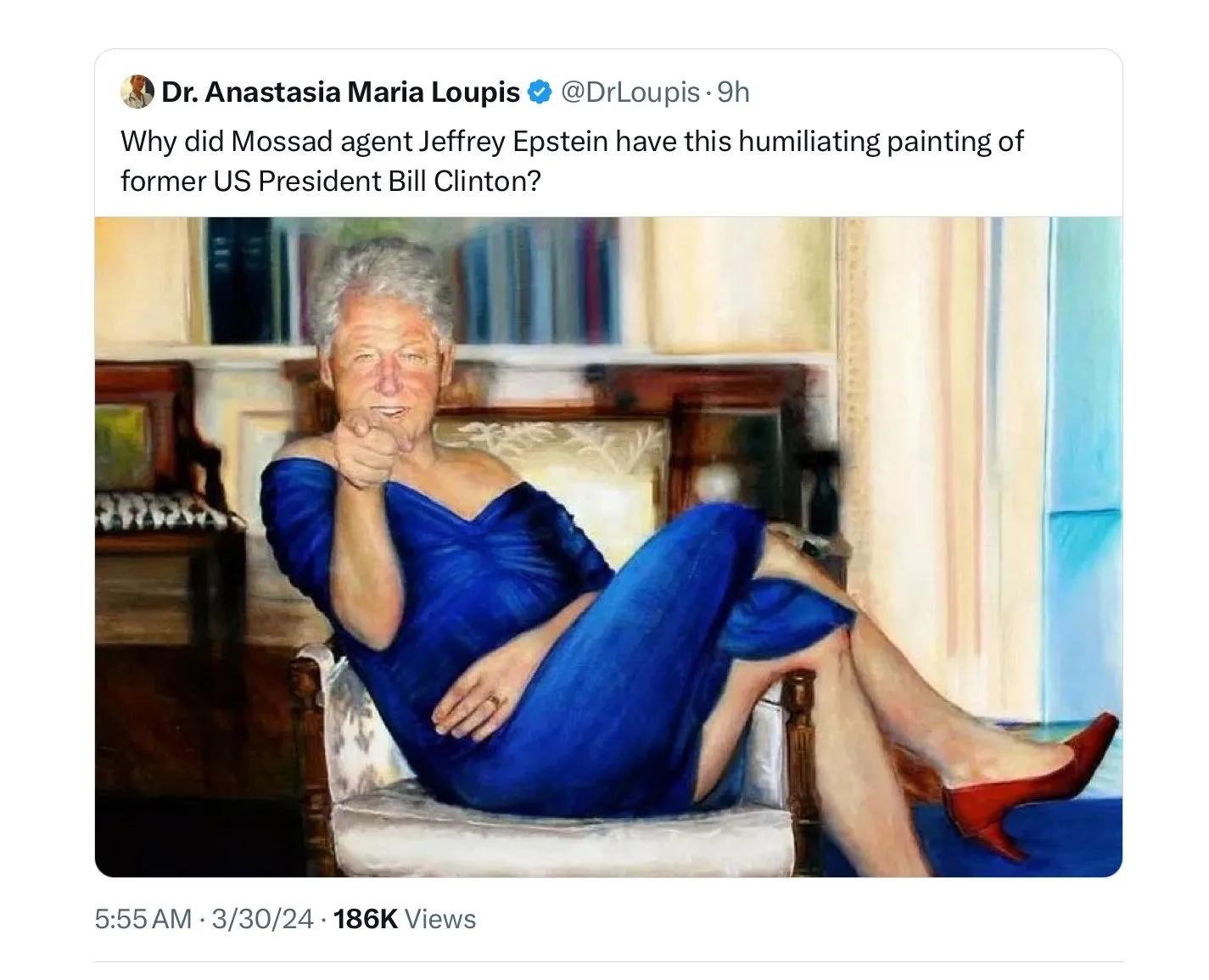 二十后,爱泼斯坦的恶魔岛事件被揭发,在爱泼斯坦的住所,发现了一张克林顿身穿蓝衣的画像。